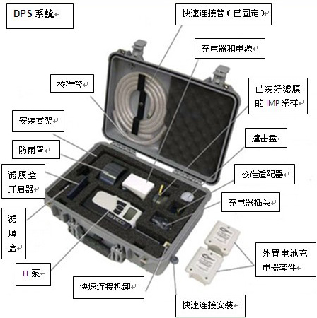 DPS系統包括一個Leland  Legacy  采樣泵帶連接器, 充電器(100-240 V), 2 個外部電池組件與適配器 ( 單獨包裝), IMPACT* 采樣頭, 2 個濾膜盒, 校準適 配器, 采樣頭的雨罩, 25片裝一次性沖擊片( 有保質 期), 濾膜盒開啟器, 與接頭快速連接管, 校準管和安 裝支架, 一個耐用帶鎖便攜箱。DPS系統包括帶鋰 電池的Leland Legacy泵,只能用于非防暴環境。