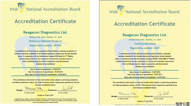 愛爾蘭Reagecon公司是歐洲著名標準品和標準物質生產廠家,公司獲得ISO17025,GUIDE37 多項嚴苛認證。