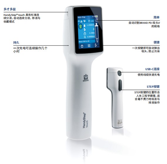 快速輕松地在各功能之間來回滑動切換,所需信息一覽無遺:觸屏操作提供了諸多優勢。隨著 HandyStep® touch 連續分液器的面世,BRAND 現也可提供帶觸摸屏的手持式實驗室設備。現代操作理念讓工作從一開始就簡單高效。該儀器整合了幫助功能與說明,為用戶現場操作提供了強大支持。