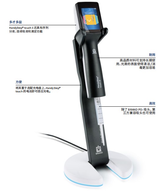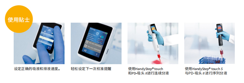 - HandyStep® touch 具有連續分液功能、自動分液功能和移液功能,HandyStep® touch S 額外具有序列分液功能、連續吸液功能和滴定功能