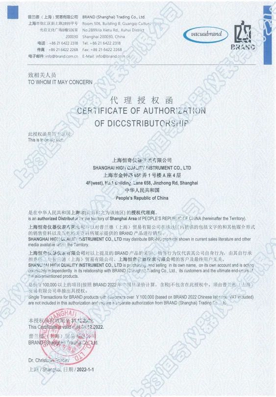 上海恒奇儀器儀表有限公司多年來一直是BRAND優(yōu)秀授權經(jīng)銷商,為客戶提供專業(yè)的服務,合理的價格,高效的售后服務,良好的信譽與廣大客戶建立了長期友好的合作伙伴關系。