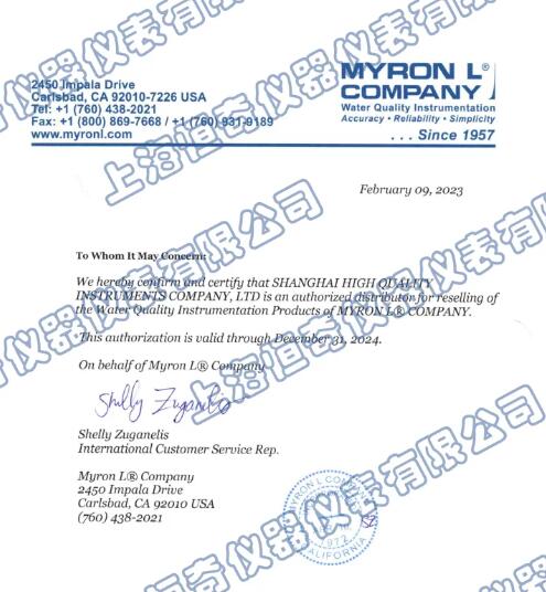 上海恒奇儀器儀表有限公司為美國麥隆公司(Myron L® )在中國大陸地區指定唯1授權經銷商。
