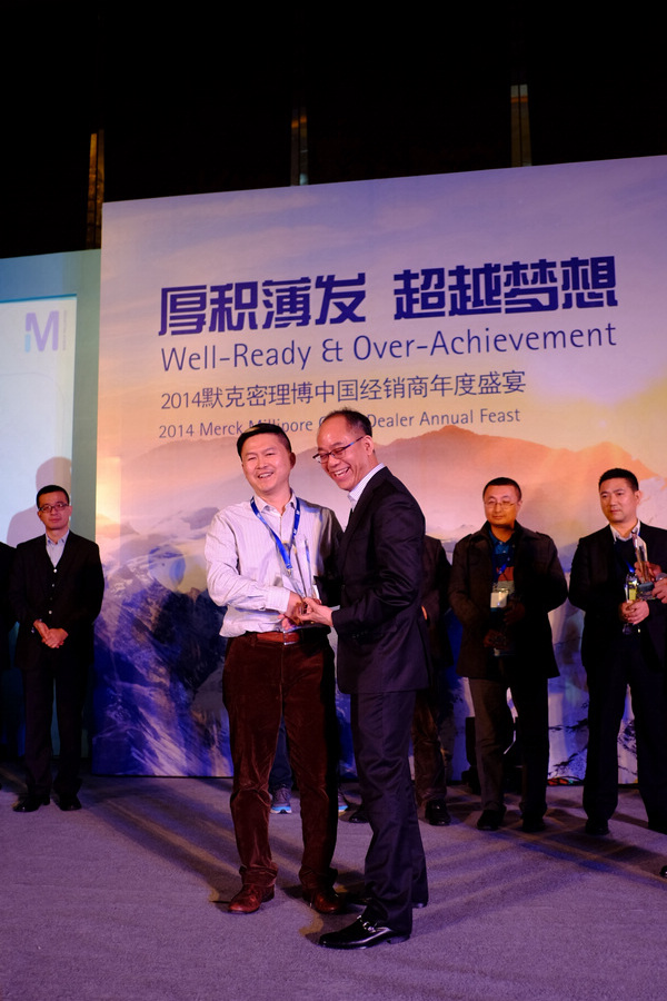 熱烈祝賀恒奇儀器再次榮獲MERCK密理博最佳銷售業績獎2014年度MERCK密理博經銷商大會地點:廈門國際會議中心酒店時間:2014年3月7日會議過程1、全體經銷商大會包括部門業務介紹 2、各業務部門(BI,BM,LE, LW,BPS,PCS)經銷商分會3、及默克密理博主力市場之產品布局介紹 總經理左克唯接受MERCK密理博大中國區總裁 Ray Shin頒獎總經理左克唯代表中區代理商表演節目2014年獎杯