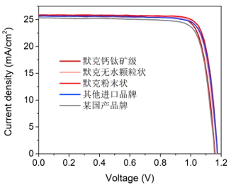 在實際測試的過程中,使用默克純度為99.999%的碘化鉛材料(貨號203602),相對于其他品牌的材料,轉換效率(PCE)的提升可高達1%與其他進口品牌相比,該產品的實際器件表現同樣占據明顯的優勢。