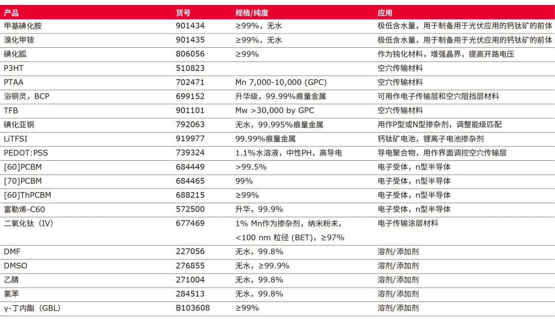 上海恒奇攜手Sigma-Aldrich®除了能為您提供金屬鈣鈦礦層原料,還能為您提供以有機鹵化物、空穴傳輸材料、二氧化鈦合成原料、透明玻璃基底及電極材料、富勒烯衍生物、無水溶劑等產品,部分熱銷產品如下: