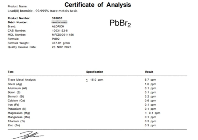 高純金屬鹽材料是默克(Sigma-Aldrich®)一直以來的明星產品,擁有純度高,批次間一致性好等特點,并且擁有多種級別可供選擇。這些產品全部由默克位于美國伊利諾伊州Urbana的工廠生產,該工廠建于1995年,至今一直穩定地供應著不同種類的高質量金屬無機鹽。在鈣鈦礦太陽能電池的應用中,作為吸光層最常使用的材料,碘化鉛對于鈣鈦礦器件的使用效率和性能有著明顯的影響,是默克熱銷的明星產品之一。