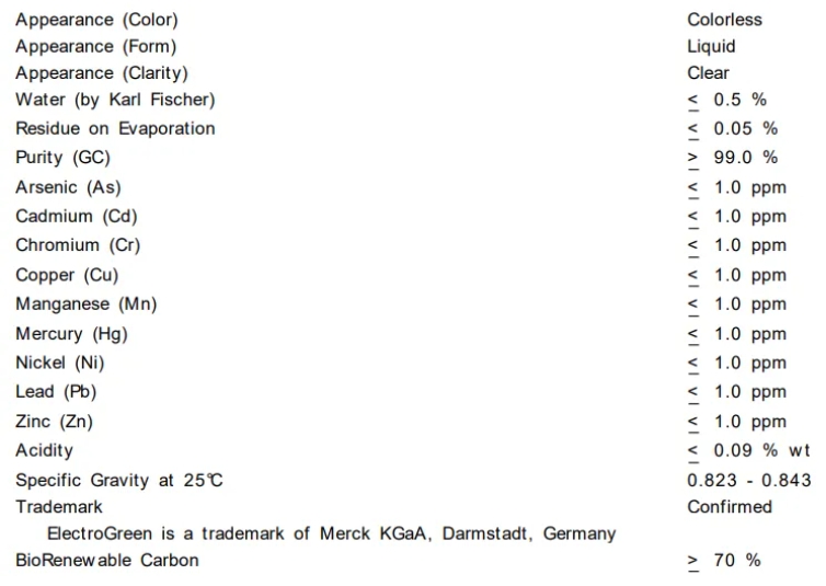 ·ElectroGreen®對于含水量,含酸量以及微量金屬含量都有著嚴格的控制。以某一批次的異丙醇替代(ElectroGreen®)為例,其中的技術含量都達到了ppm級別,對于電子相關應用的不會帶來額外的影響。