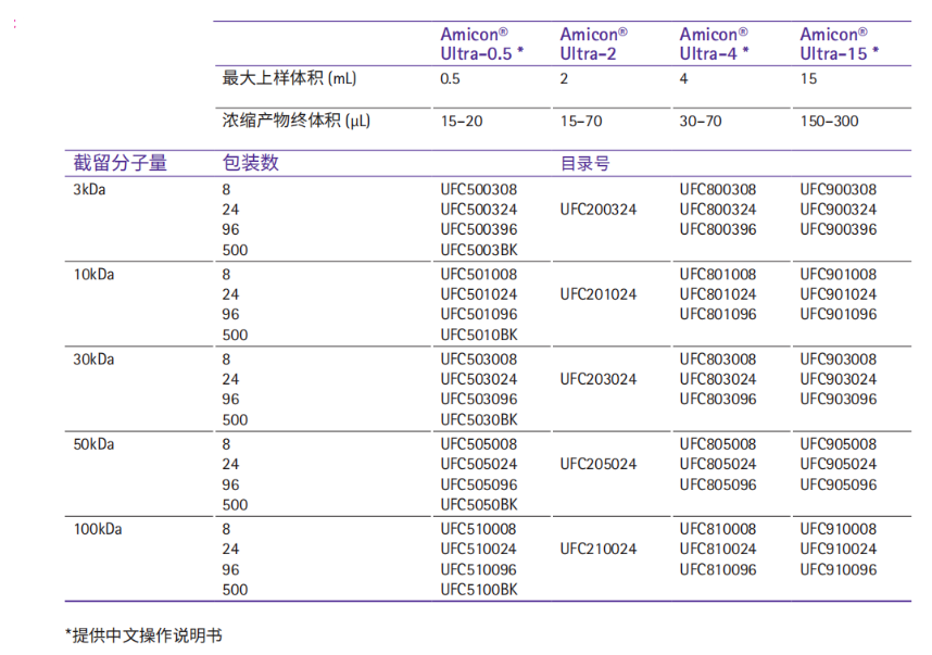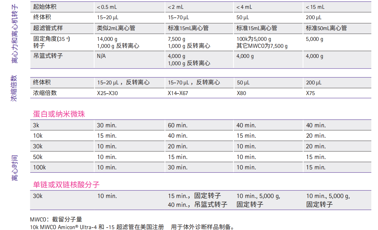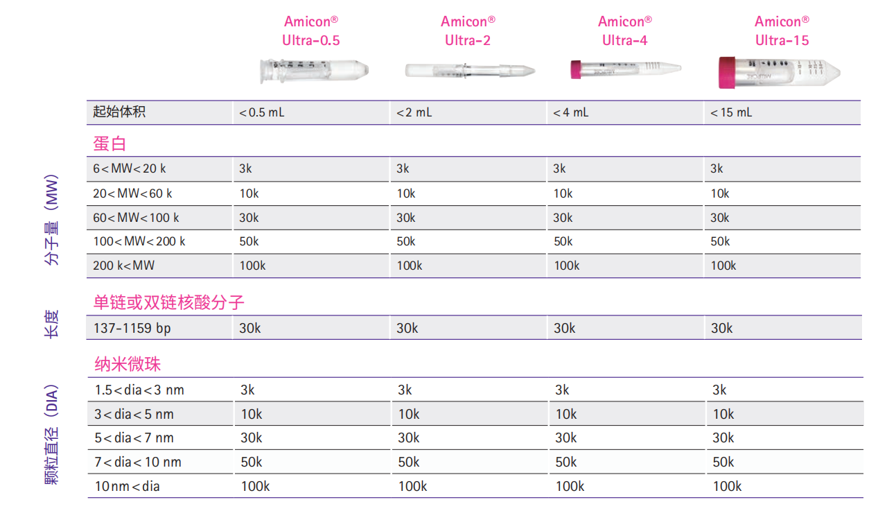 Amicon® Ultra系列超濾管產品需要根據起始樣品體積、目標蛋白或核酸的分子量、終體積及濃縮倍數等選擇具體型號。下表為選擇最適合截留分子量的超濾管提供了一些參考建議