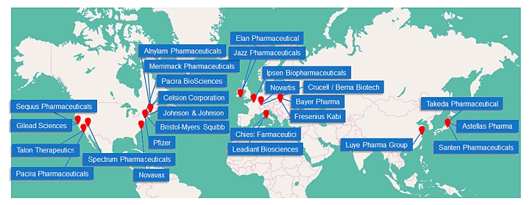半個多世紀以來,脂質體一直被認為是醫學的強大工具,能夠將治療藥物可控地封裝并輸送到體內特定位置,這使得它們可用于治療各種疾病。許多LNP藥物制劑已獲批上市并用于醫療實踐(圖1)。根據最近的市場分析以及基于LNP的已上市藥物信息,全球脂質體藥物遞送市場的主要參與者如圖2所示。